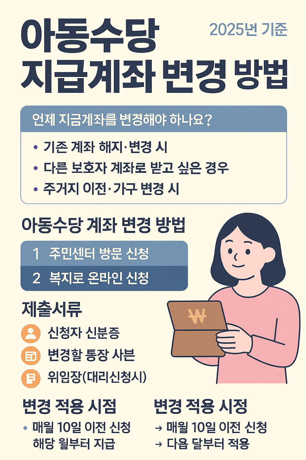 2025년에도 아기를 키우는 가정을 위한 다양한 복지 혜택이 이어지고 있습니다. 그중에서도 출산후 아이를 키우는 가정이라면 누구나 받을수 있는 대표적인 복지 혜택, 바로 아동 수당입니다. 오늘은 2025년 기준 아동 수당 지급 대상 신청방법 지급 계좌변경등 궁금한 부분에 대해 아래에 알려드리겠습니다. 출산 후 받을 수 있는 쏠쏠한 혜택! 잊지말고 지금 바로 신청하세요.